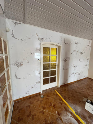 Ez a falpanel 244×122 cm, 3 mm vastag, 18,5 kg – könnyű és tartós burkolóanyag. Könnyedén telepíthető építési ragasztóval, sniccerrel vagy körfűrésszel vágható.